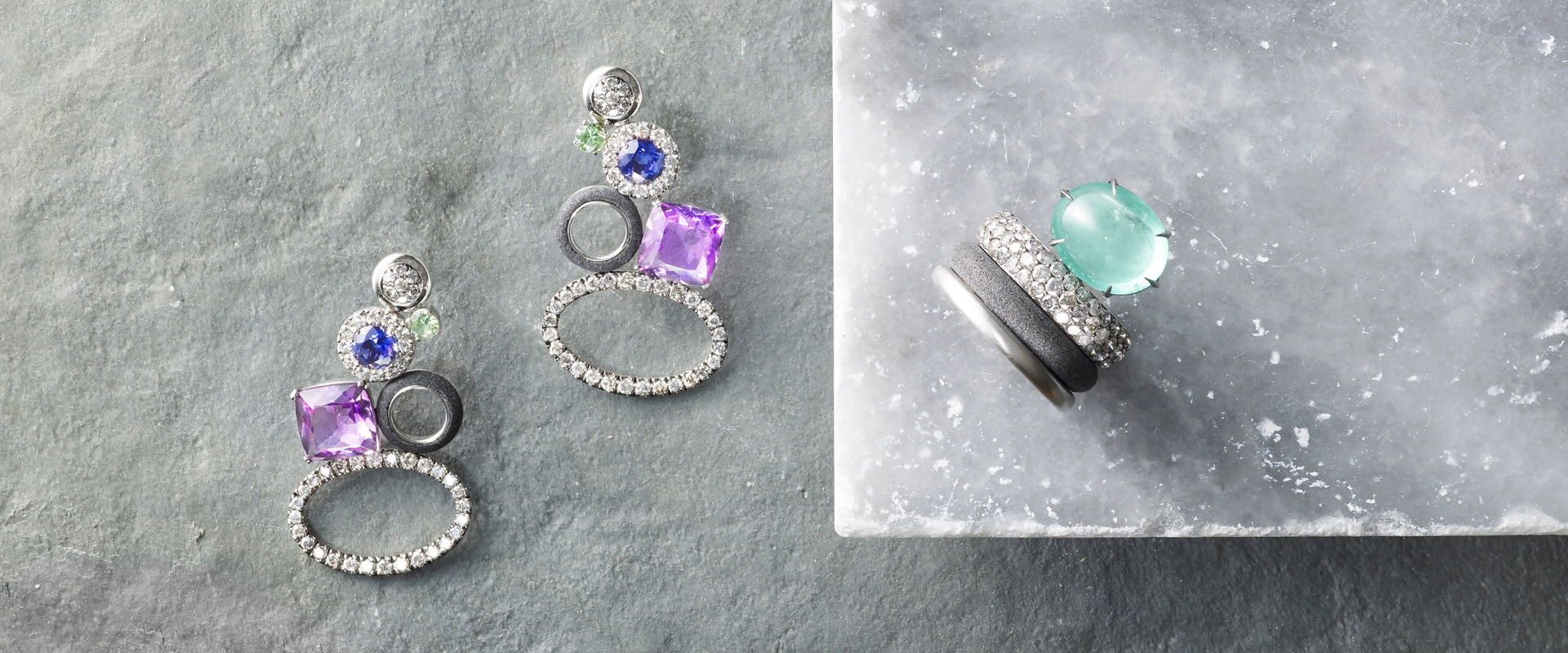 A vibrant collection, a true reflection of the Hindu Festival of Colours. Adorned with Amethyst, Iolite, Peridot, Diamonds, and Grey Marble, these pieces are the ideal statement piece for your spring jewellery collection, adding a splash of festive elegance to any look.